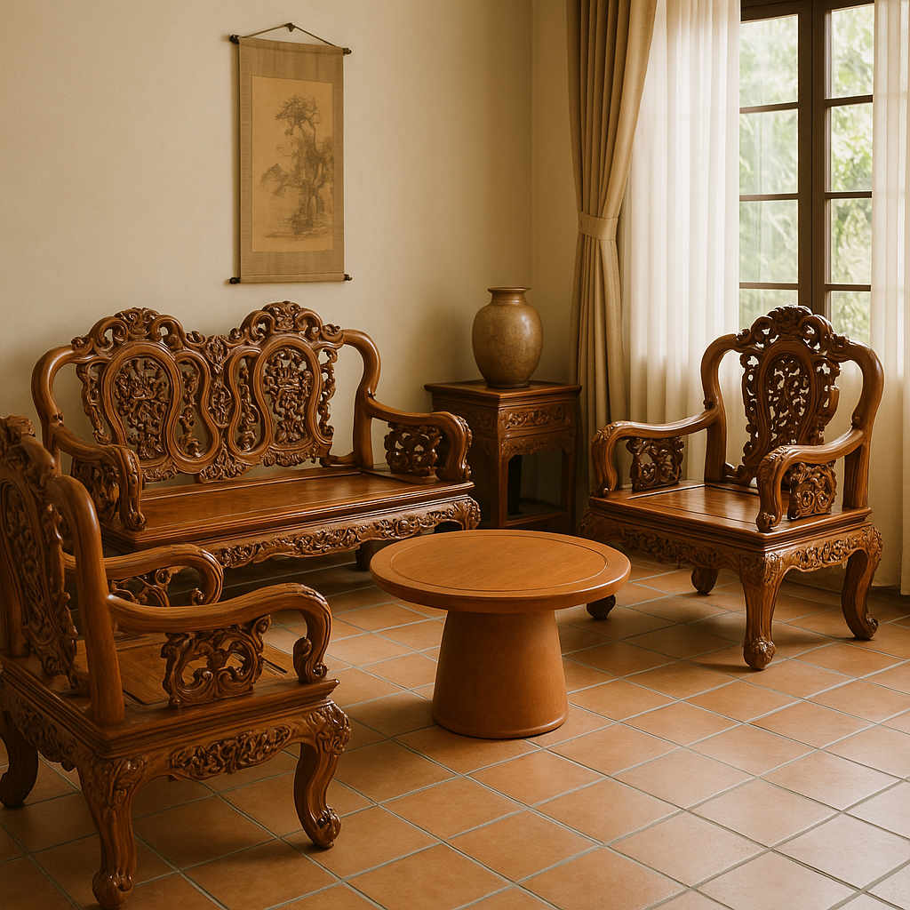 Không thể thiếu trong danh sách là những bộ bàn ghế theo phong cách Việt truyền thống – một phần văn hóa nội thất lâu đời vẫn còn được gìn giữ tại nhiều vùng miền.