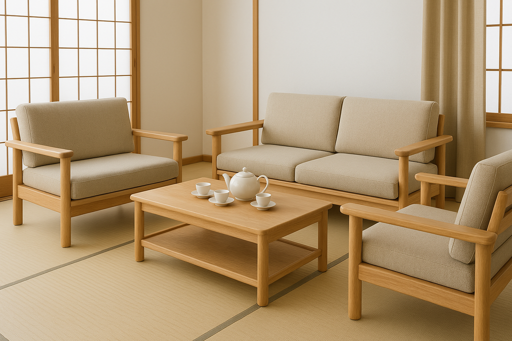 - **Nhật Bản**: Các bộ bàn ghế phong cách Nhật thường thấp, dùng cùng chiếu tatami hoặc đệm ngồi bệt. Gỗ sáng màu, bề mặt mộc và không có nhiều chi tiết trang trí. Đây là lựa chọn lý tưởng cho người yêu sự yên tĩnh, thiền định, phù hợp với không gian mở hoặc có nhiều ánh sáng tự nhiên.