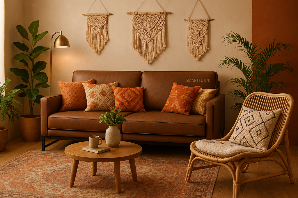- **Bohemian (Boho)**: Màu sắc rực rỡ, họa tiết thổ cẩm, chất liệu đan móc thủ công. Ghế sofa Boho thường là loại đệm rời, kết hợp với nhiều gối tựa họa tiết độc đáo. Kết hợp với thảm trải sàn, đèn sợi tóc và cây xanh sẽ tạo nên không gian tràn đầy năng lượng.